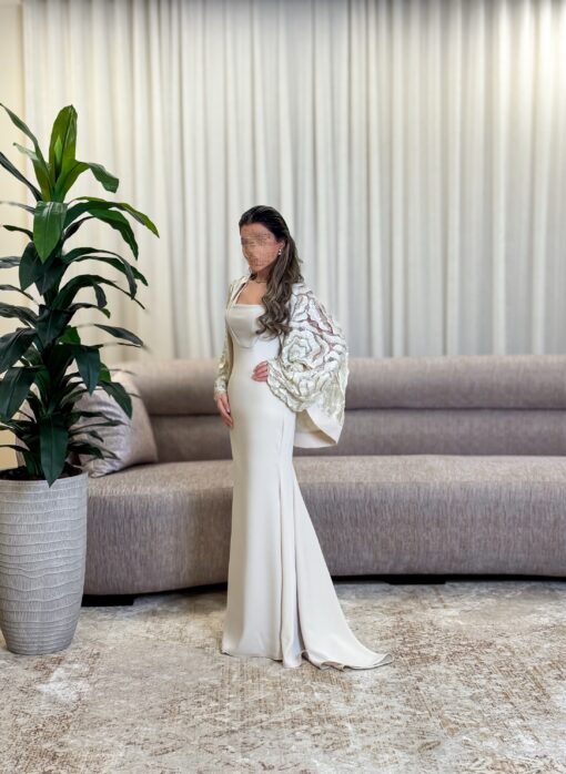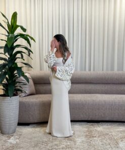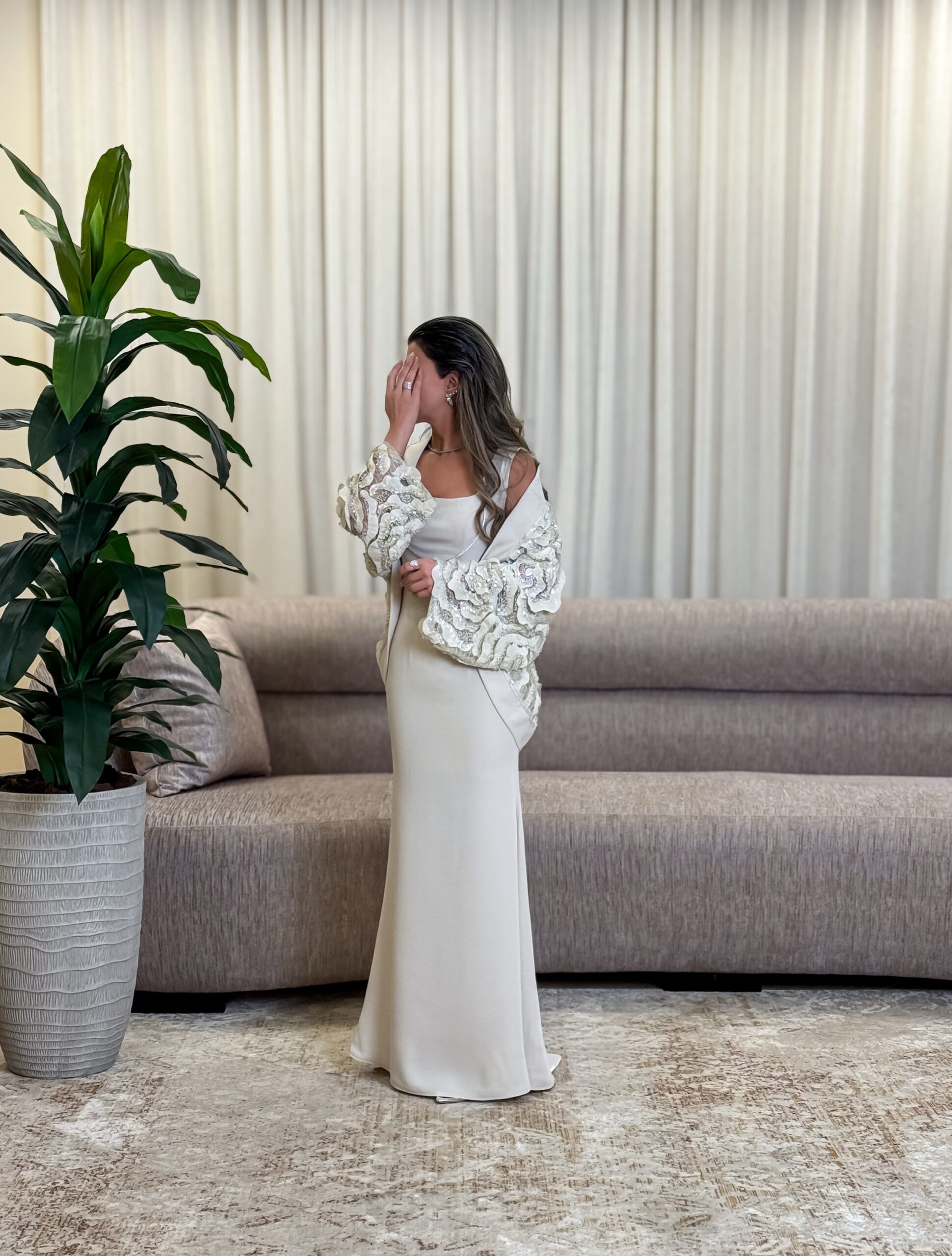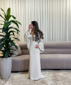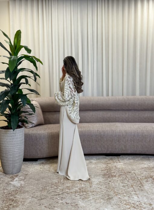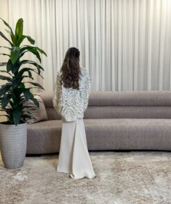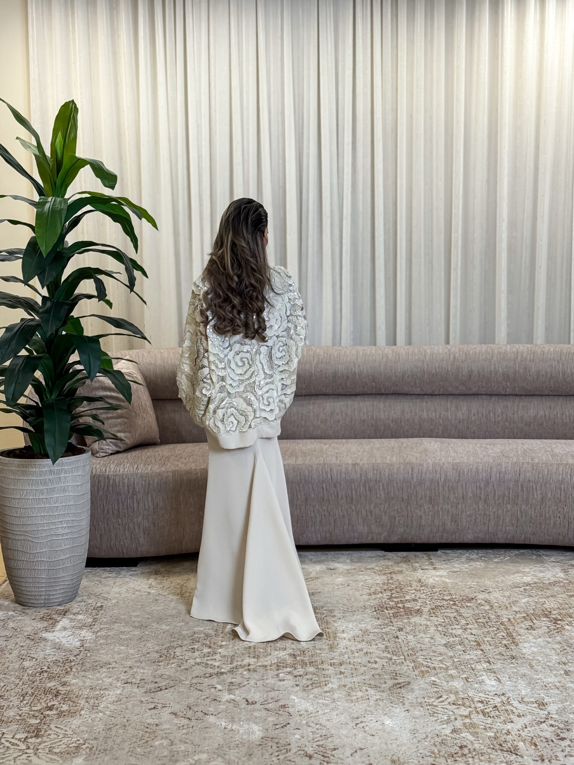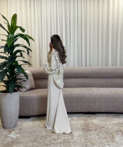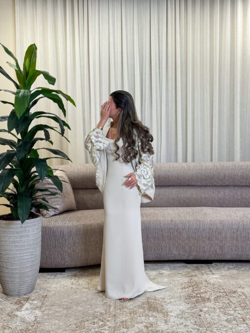البدله عباره عن قطعتين ( جاكيت + دريس ) الجاكيت دانتيل مشغول بلولو وكرستال واورقنزا